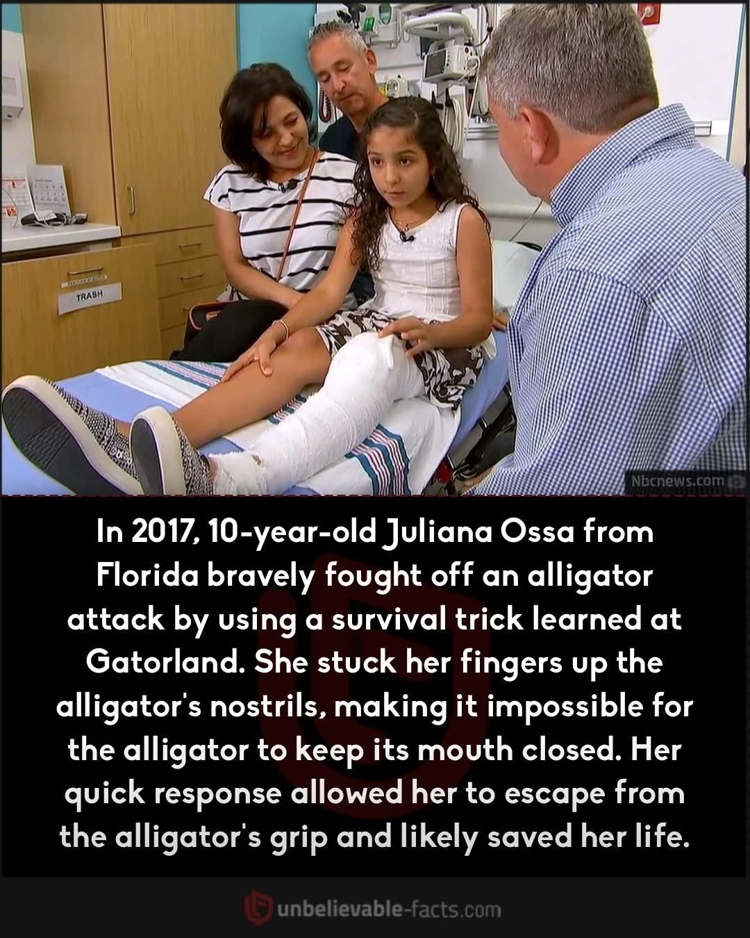 In 2017, a 10-year-old girl from Florida named Juliana Ossa became a living symbol of courage and quick thinking when she survived a terrifying alligator attack. 🌴😱 While swimming near her home, the unthinkable happened — an alligator suddenly clamped its powerful jaws around her leg and began to pull her underwater. Most adults would freeze in panic, but Juliana remembered a survival trick she once learned at Gatorland.