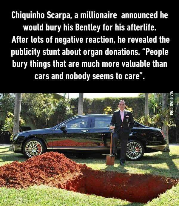 But just when the world was ready to judge, Scarpa revealed the shocking truth. It was all a publicity stunt โ a powerful message about organ donation. ๐ก He said, โPeople bury things that are much more valuable than cars and nobody seems to care.โ He wasnโt talking about metal and engines โ he was talking about human organs, buried every day with people who could have saved lives. ๐