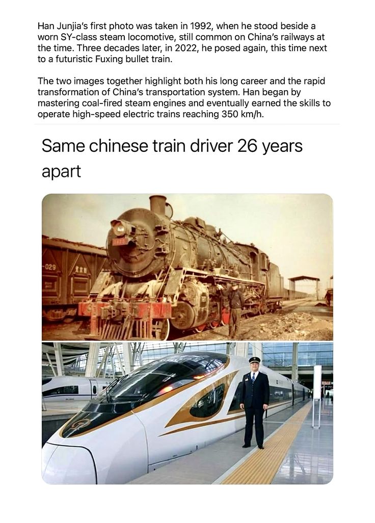 Between these two photos lies a story of transformation β not just of machines, but of a man and his nation. Han went from shoveling coal into a furnace to operating a digital control panel, mastering one of the worldβs most advanced rail systems. His journey mirrors Chinaβs own β from the smoke of the industrial past to the brilliance of a futuristic tomorrow π