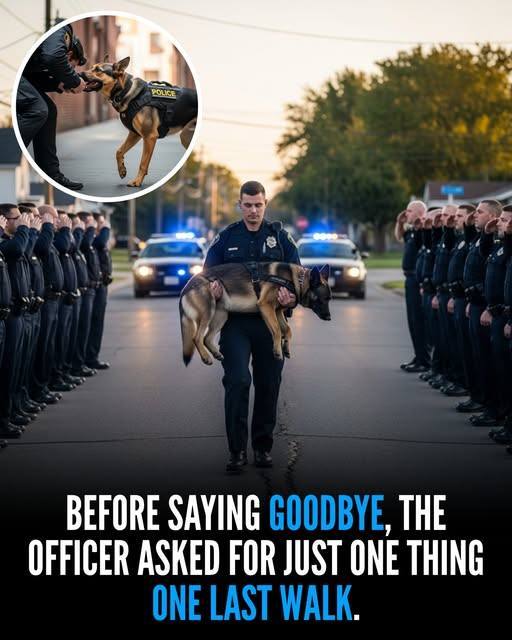 When the time came to say goodbye, the moment was filled with both honor and heartbreak. Officer Randall carried his partner through the police station one last time, holding him with quiet dignity and deep sorrow. Fellow officers lined the hallway in respectful silence, saluting not just a dog, but a hero who had never asked for praise—only a pat on the head, a favorite toy, and the chance to serve. The air was heavy with emotion, as one chapter ended and a lasting legacy began.