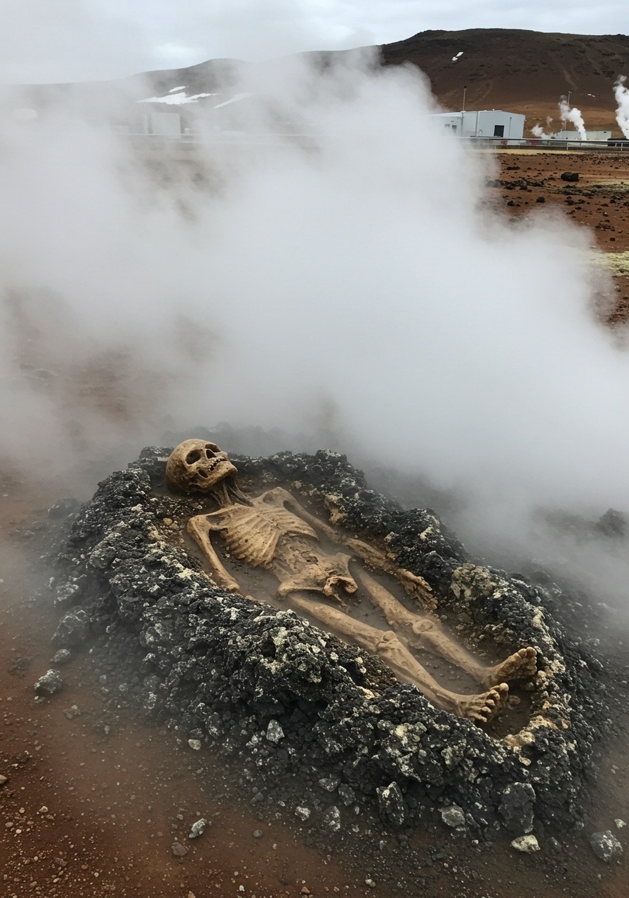 An extraordinary archaeological find has been reported within an active geothermal zone, where a team of geologists conducting routine fieldwork stumbled upon a human-like skeleton partially embedded in volcanic rock. The discovery site, characterized by constant plumes of vapor and mineral-rich soil, has baffled experts for one reason above all — the skeleton’s state of preservation. Despite being located in an environment defined by heat, sulfuric gases, and corrosive minerals, the remains appear strikingly intact. The bones exhibit an unusual, almost glazed surface texture, leading researchers to speculate that rapid mineralization or an unknown geological process may have encased the body soon after death. The skeleton’s posture — reclined but deliberate — and its placement within hardened lava deposits have raised further questions about how and when it came to rest in such an inhospitable setting.