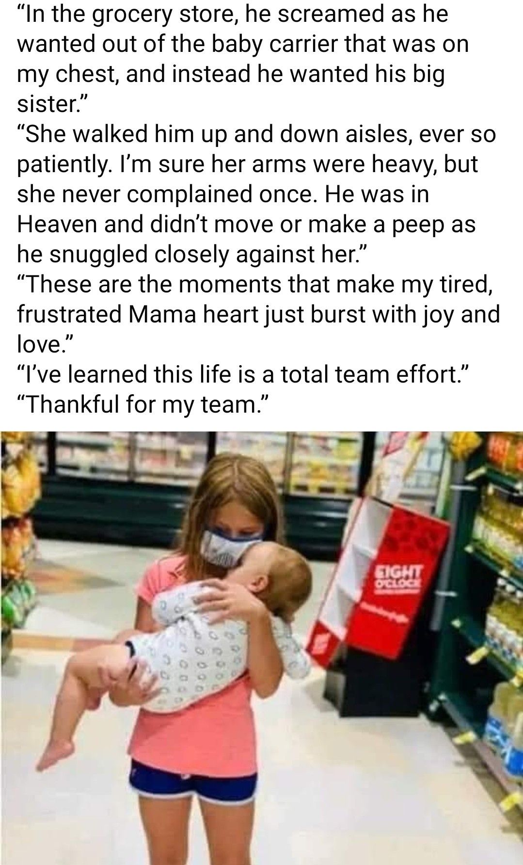 In the middle of a busy grocery store, a mother’s patience was running thin. Her baby screamed and squirmed in the carrier, refusing every soothing attempt. But then, something beautiful happened — he reached out, not for his mother, but for his big sister. Without hesitation, the young girl stepped in, her small arms opening wide with love and calm. She carried her baby brother through the aisles, rocking him gently as if she had been doing it her whole life.