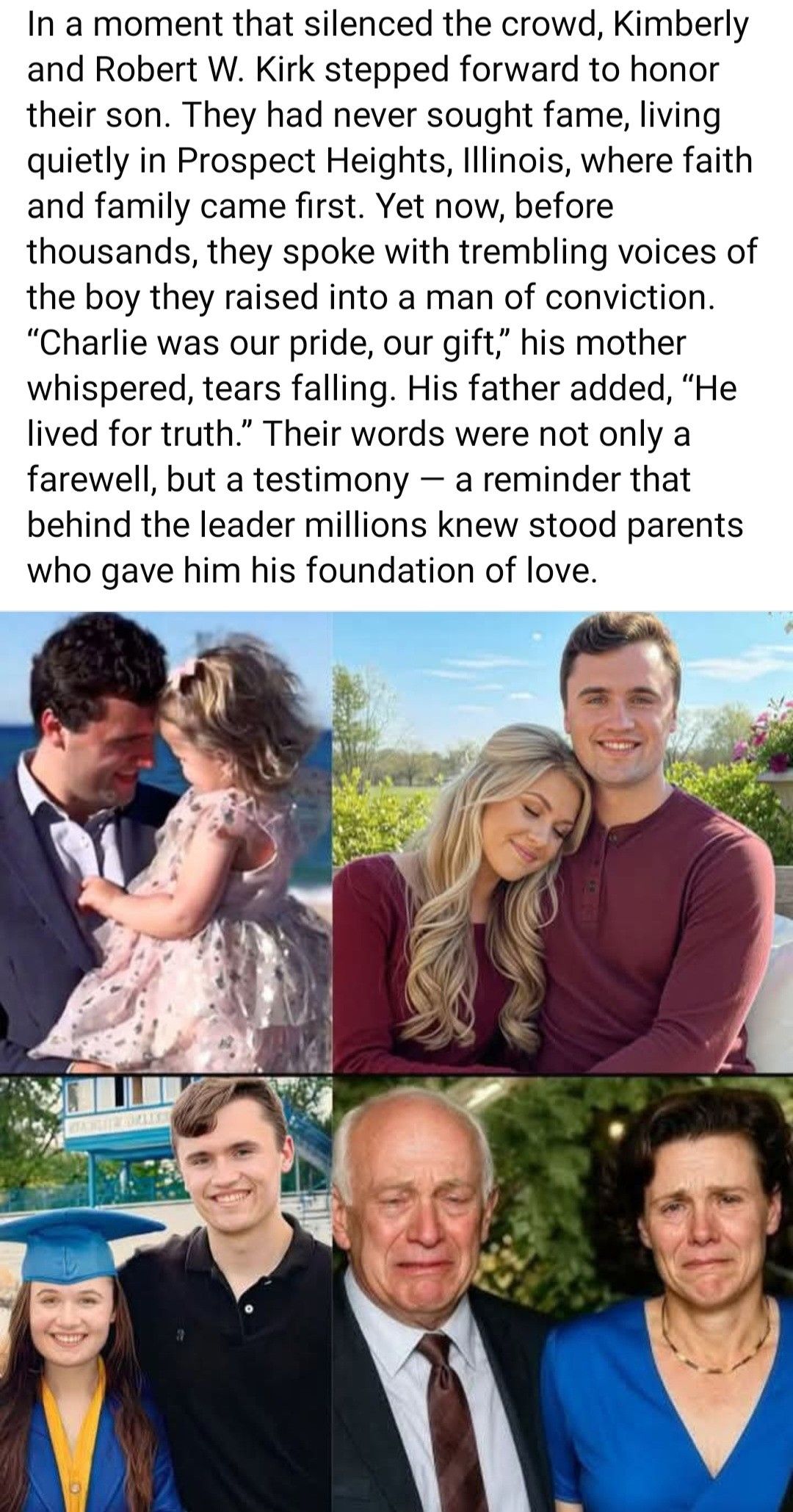 In a moment that silenced an entire crowd, Kimberly and Robert W. Kirk stepped forward, hearts trembling, to honor their beloved son. They were not public figures โ just humble parents from Prospect Heights, Illinois, who had lived a quiet life rooted in faith, family, and simple love. Yet on this day, before thousands, their words carried the weight of a lifetime โ a lifetime of sacrifice, teaching, and unwavering devotion.