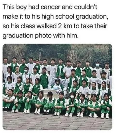 In a world often rushing forward, one group of students chose to slow down β to walk 2 kilometers, not for a ceremony or a medal, but for love. Their classmate, a young boy battling cancer, was too weak to attend his high school graduation. Yet instead of taking their photo without him, his entire class decided to bring graduation to him. Dressed in their green uniforms, they journeyed together under the open sky, carrying not just caps and smiles, but a message of unity that words could never express.