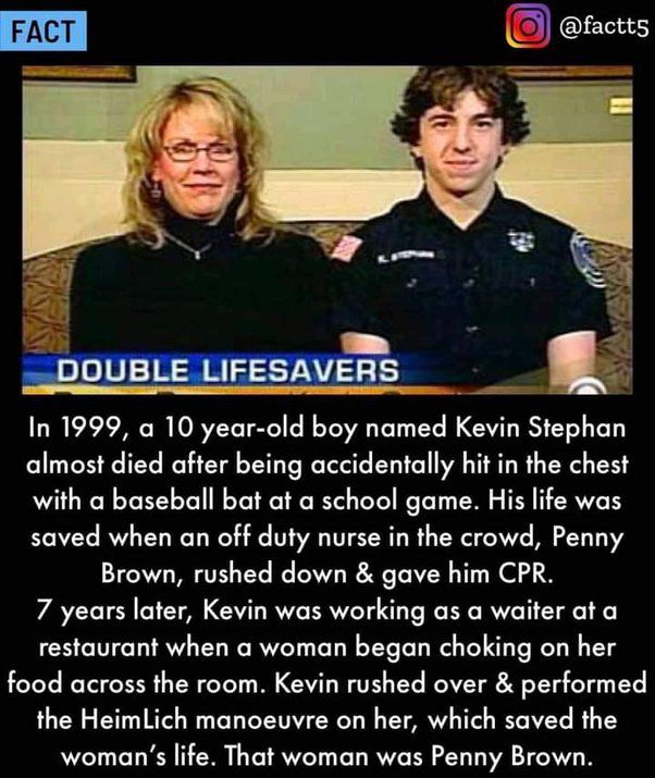 Seven years later, destiny would reunite them β this time with their roles reversed. While working as a waiter, Kevin noticed a woman choking across the restaurant. He immediately ran to her aid and performed the Heimlich maneuver, saving her from suffocating. Only after the crisis passed did he realize who she was: the same woman who had saved his life years before β Penny Brown.