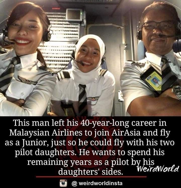Some dreams aren’t about reaching the skies — they’re about flying together. This touching photo captures a father’s love that goes beyond measure. After spending 40 years flying with Malaysian Airlines, this veteran pilot made an incredible decision: he left his senior position and joined AirAsia as a junior pilot — all so he could share the cockpit with his two daughters, who had just begun their own journeys as pilots.