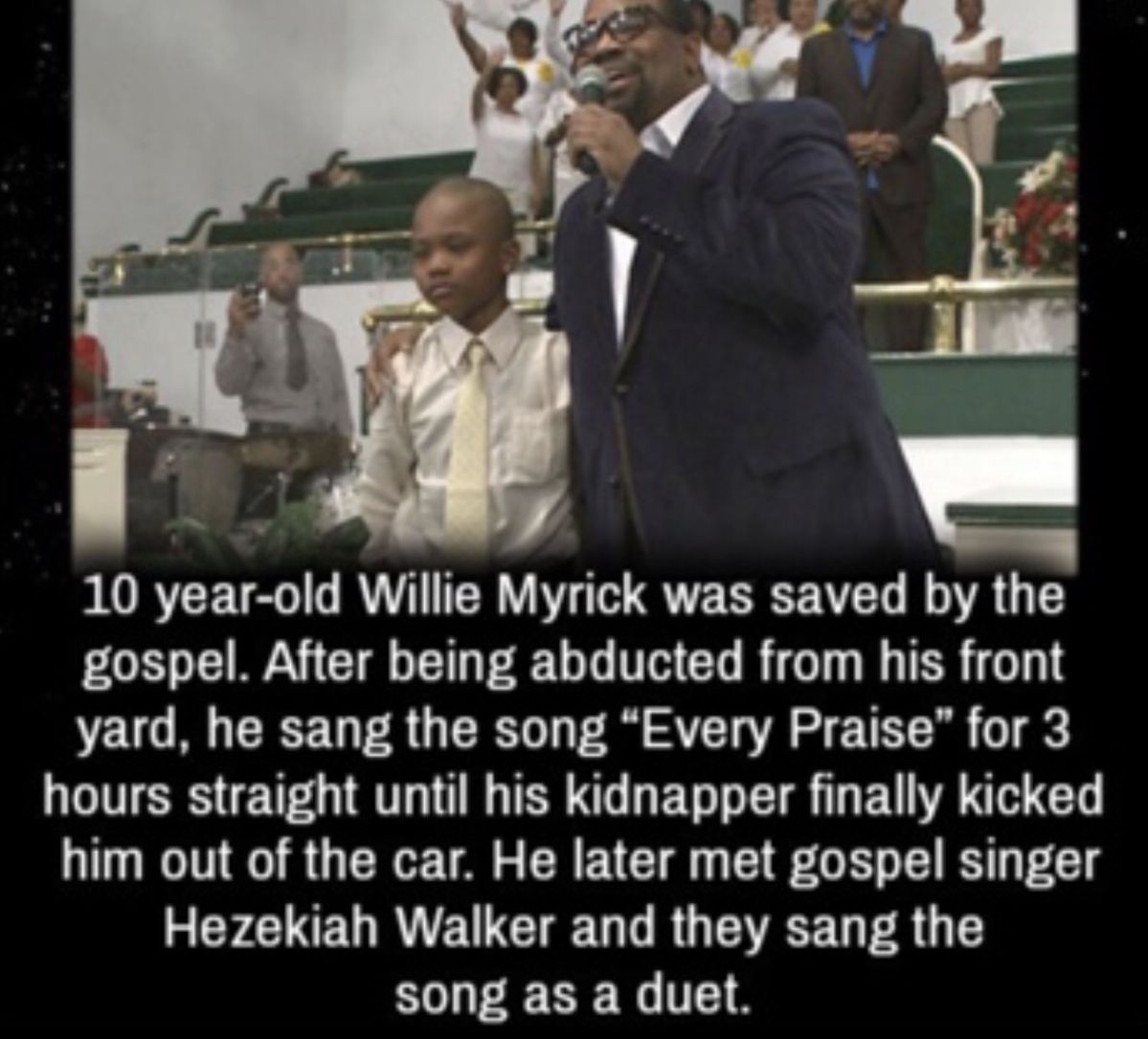 At just 10 years old, Willie Myrick faced a moment that would test even the strongest of hearts. One day, while playing in his front yard, he was abducted by a stranger and forced into a car. Fear could have silenced him โ but instead, Willie chose faith. For three straight hours, he sang the gospel song โEvery Praiseโ by Hezekiah Walker, his voice unwavering, filling the car with hope and defiance. The kidnapper shouted for him to stop, but Willie kept singing โ louder, stronger, refusing to let darkness win.