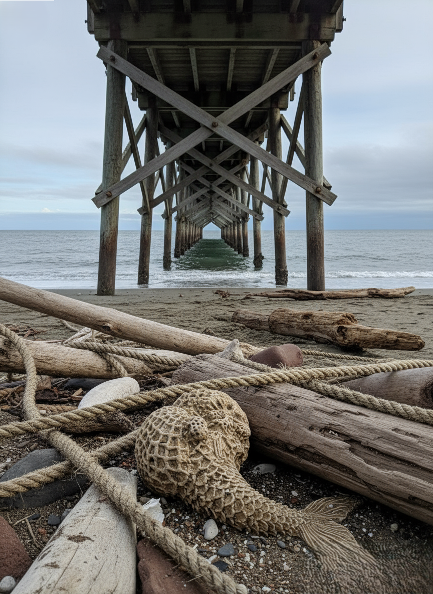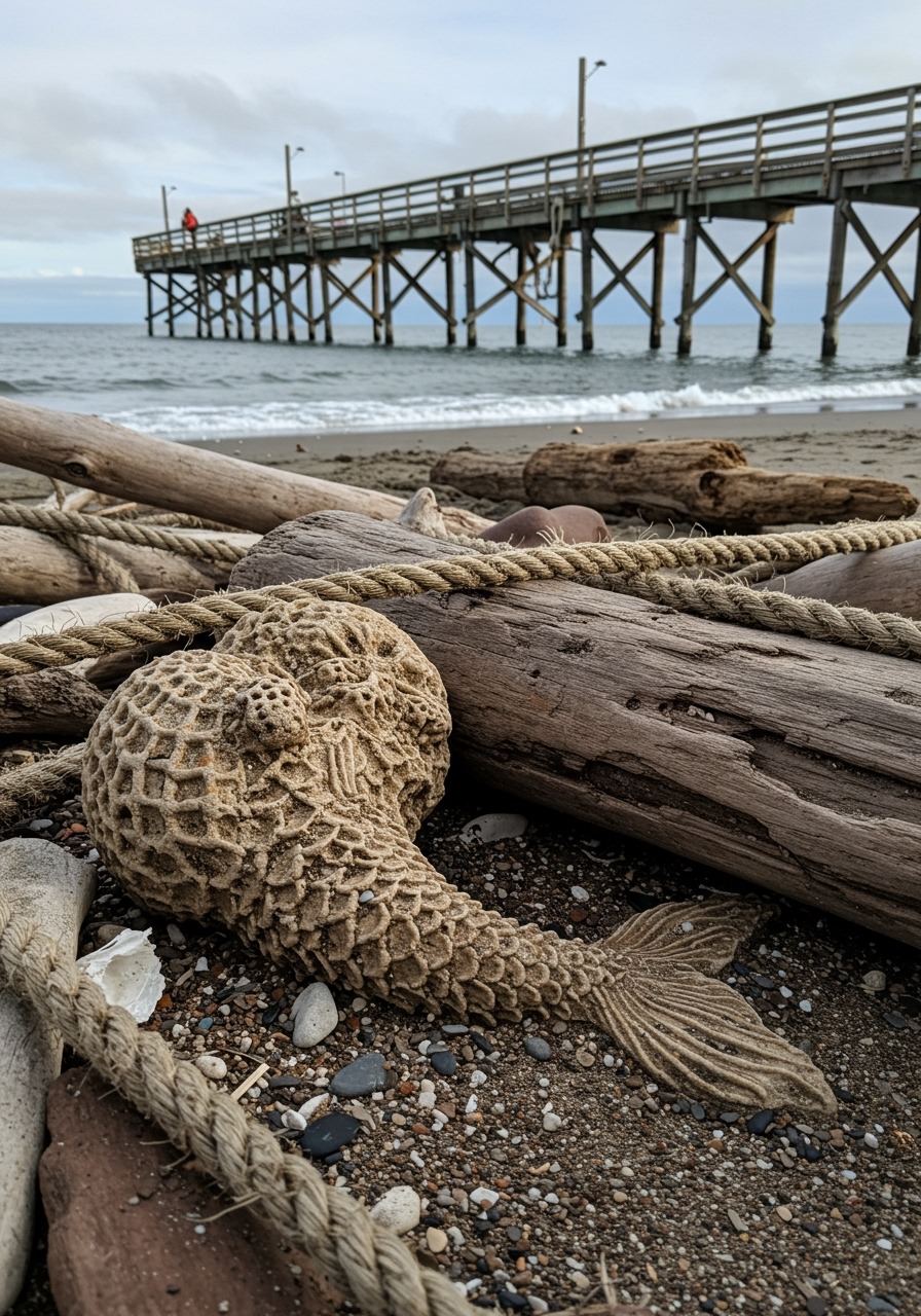 Residents of a small coastal town were left stunned this week after fishermen discovered what appears to be a fossilized humanoid form washed ashore near a local fishing pier. Entangled among driftwood and thick maritime ropes, the specimen immediately drew attention for its uncanny resemblance to a human-fish hybrid — complete with skeletal outlines, visible rib structures, and the faint impression of scaled texture along its lower half. Witnesses describe the fossil as being partially encrusted in salt deposits and barnacles, suggesting long-term submersion before its sudden arrival on the beach. Local authorities quickly cordoned off the area, while marine biologists and geologists were called in to assess the find. Early photographs circulating online show remarkable anatomical details, reigniting one of humanity’s oldest fascinations: the possibility that the mythical “mermaid” may have roots in biological reality.