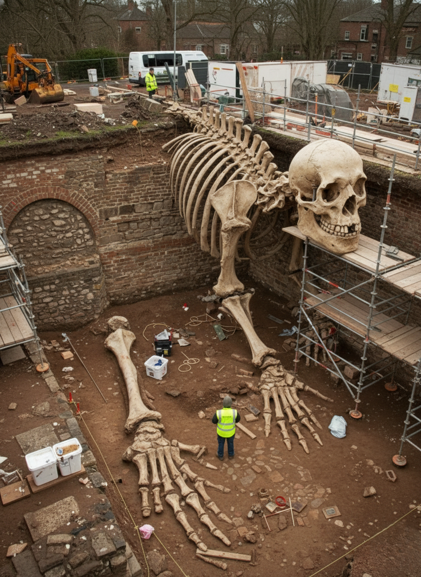 Archaeologists conducting a joint excavation with construction crews have uncovered what may be one of the most extraordinary — and controversial — finds in modern history: the fossilized remains of an enormous humanoid skeleton buried deep beneath the foundations of an ancient structure. Measuring several times larger than any known human remains, the bones exhibit proportions that defy established models of human evolution. Early field reports describe a massive ribcage, elongated limb bones, and a skull of remarkable size and symmetry, all encased in compacted layers of earth and stone. The site itself, located in an area rich with prehistorical artifacts, shows evidence of deliberate burial rather than natural deposition. Within hours of the discovery, officials sealed off the area and imposed strict access controls, citing “safety and preservation concerns.” Yet eyewitness accounts of government vehicles and private research teams arriving under heavy security have only intensified speculation about what authorities are trying to conceal.