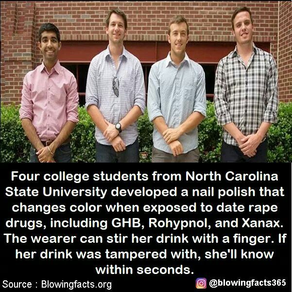 Four brilliant students from North Carolina State University turned concern into creation β developing a nail polish that changes color when exposed to date rape drugs such as GHB, Rohypnol, and Xanax. π‘π
