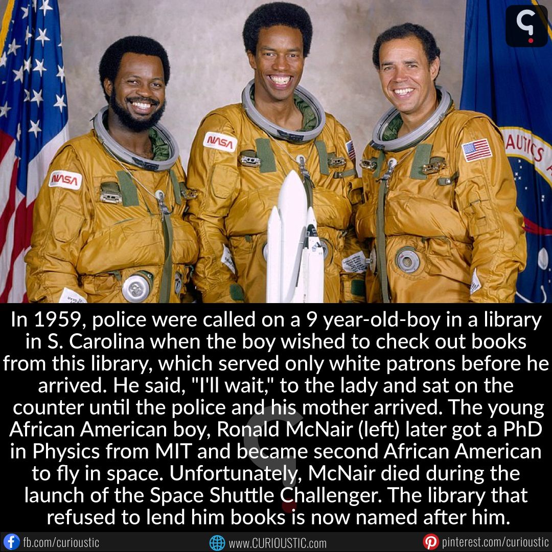 This powerful photograph tells a story that begins not in the skies, but in a small segregated library in South Carolina in 1959. A 9-year-old boy named Ronald McNair simply wanted to borrow some books β but because of the color of his skin, he was told he couldnβt. When the librarian called the police instead of helping him, young Ronald didnβt cry or walk away. He calmly said, βIβll wait.β He sat on the counter, patient and fearless, waiting for justice to arrive. That moment β a quiet act of resistance β would become the seed of a lifelong pursuit of knowledge, courage, and equality. πβπΎ