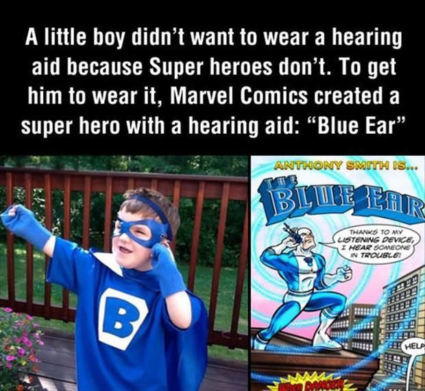 What happened next was pure magic. ✨ The artists and writers at Marvel were so touched by Anthony’s story that they created a brand-new superhero — one who looked like him, one who wore a hearing aid — and named him “Blue Ear.” 💥