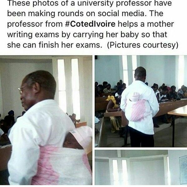 In an ordinary university in Côte d’Ivoire, an extraordinary act of kindness turned an exam day into a life lesson the world will never forget. 🌍✨ A dedicated professor noticed one of his students struggling—not with the test paper, but with her baby. The young mother had brought her child to class, unable to find anyone to care for the little one while she sat for her final exam. Instead of sending her away or scolding her for the distraction, the professor did something truly remarkable — he took the baby in his arms, wrapped the child securely on his back, and continued supervising the exam so she could write in peace. 💕