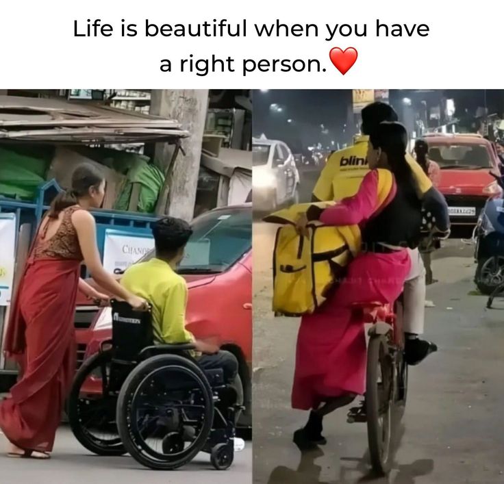 In one part of the photo, the woman gently pushes her partner’s wheelchair through the street, her sari brushing the pavement, her eyes focused only on him. In the next, roles reverse — he pedals a bicycle with determination, while she holds on tight behind him, balancing a heavy delivery bag, helping him make ends meet. 💪🚴♀️ Together, they embody teamwork in its purest form — equal partners, sharing effort, dreams, and resilience.