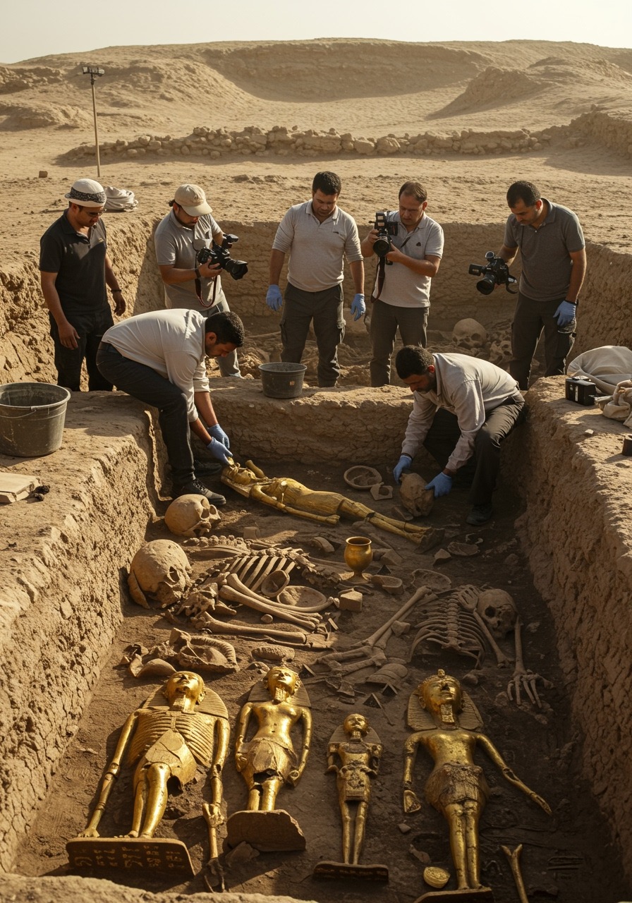 A discovery straight out of legend has stunned the archaeological world—a hidden burial site where fragile human skeletons rest beside glittering golden sarcophagi, untouched for millennia. This breathtaking finding has ignited global fascination and fierce debate, prompting questions about the identities of those interred within this ancient resting place. Were they forgotten kings, divine beings, or perhaps members of a secret order erased from time?