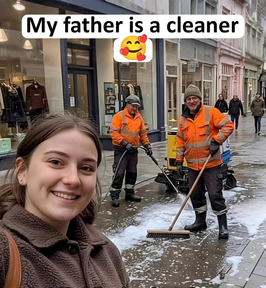 In a world that often celebrates titles, luxury, and fame, this picture speaks of a purer kind of pride — one born from love, gratitude, and humility. A young woman smiles brightly into the camera, capturing a moment that melts hearts around the world. Behind her stands her father — dressed in an orange reflective jacket, hands steady on his broom, cleaning the streets with quiet dignity. The caption reads simply: “My father is a cleaner.”