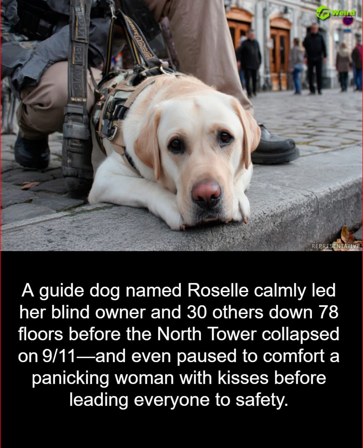 When the first plane struck the North Tower of the World Trade Center, Roselle and her blind owner, Michael Hingson, were on the 78th floor. Amid the chaos โ the smoke, the screams, and the blaring alarms โ Roselle stayed calm. With steady determination, she guided Michael through the burning tower, step by step, stair by stair, all the way down 1,463 steps. But Roselle didnโt just save Michael โ she also helped lead around 30 others to safety, proving that courage has no language, only instinct and love.