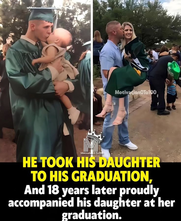 Eighteen years later, the same father stands proudly beside his grown daughter, now in her own graduation gown. This time, sheโs the one in his arms โ smiling, strong, and ready to face the world. The look on his face says it all: love, pride, and fulfillment. He didnโt just raise her; he walked every step of her journey, from her first word to her first major milestone.