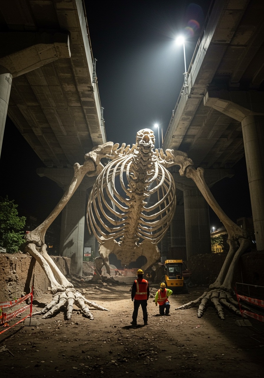 A routine infrastructure project has turned into one of the most baffling archaeological discoveries in modern times. Construction crews working beneath a metropolitan overpass were stunned to uncover what appears to be a massive humanoid skeleton embedded deep within the foundation soil. Measuring far beyond the size of any known human remains, the bones display an anatomical precision that has left scientists both awestruck and unsettled. Witnesses on site described the skeleton’s ribcage and skull as “monumental,” dwarfing nearby excavators and suggesting a height estimated at more than four times that of an average adult. The find immediately brought construction to a halt as authorities sealed off the site and summoned a joint team of anthropologists, paleontologists, and forensic experts to examine the remains. Yet within hours of the discovery, reports surfaced of government vehicles and private research teams arriving under strict security — a response that has only intensified public suspicion and speculation.