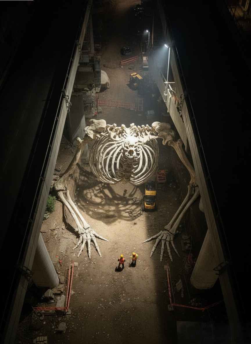 A routine infrastructure project has turned into one of the most baffling archaeological discoveries in modern times. Construction crews working beneath a metropolitan overpass were stunned to uncover what appears to be a massive humanoid skeleton embedded deep within the foundation soil. Measuring far beyond the size of any known human remains, the bones display an anatomical precision that has left scientists both awestruck and unsettled. Witnesses on site described the skeleton’s ribcage and skull as “monumental,” dwarfing nearby excavators and suggesting a height estimated at more than four times that of an average adult. The find immediately brought construction to a halt as authorities sealed off the site and summoned a joint team of anthropologists, paleontologists, and forensic experts to examine the remains. Yet within hours of the discovery, reports surfaced of government vehicles and private research teams arriving under strict security — a response that has only intensified public suspicion and speculation.