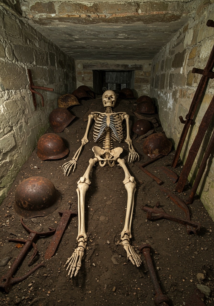 An exploration team investigating a network of sealed underground fortifications has uncovered a discovery as haunting as it is mysterious — a fully articulated human skeleton lying among rusted helmets, shattered equipment, and the decayed remains of early 20th-century weaponry. The find was made deep within a reinforced chamber that appeared untouched for decades, its walls bearing faint inscriptions and scorch marks from apparent explosions. What has shocked investigators most is the eerie symmetry of the scene: the skeleton was positioned upright against the wall, arms folded neatly over the chest, as though placed there intentionally rather than fallen by chance. Nearby, corroded dog tags, collapsed crates, and deteriorated ammunition suggest a wartime context, but no official records mention any combat or personnel lost at the coordinates where the chamber was found. Authorities have sealed off the site for forensic analysis, though images leaked online have already ignited an international wave of speculation and unease.