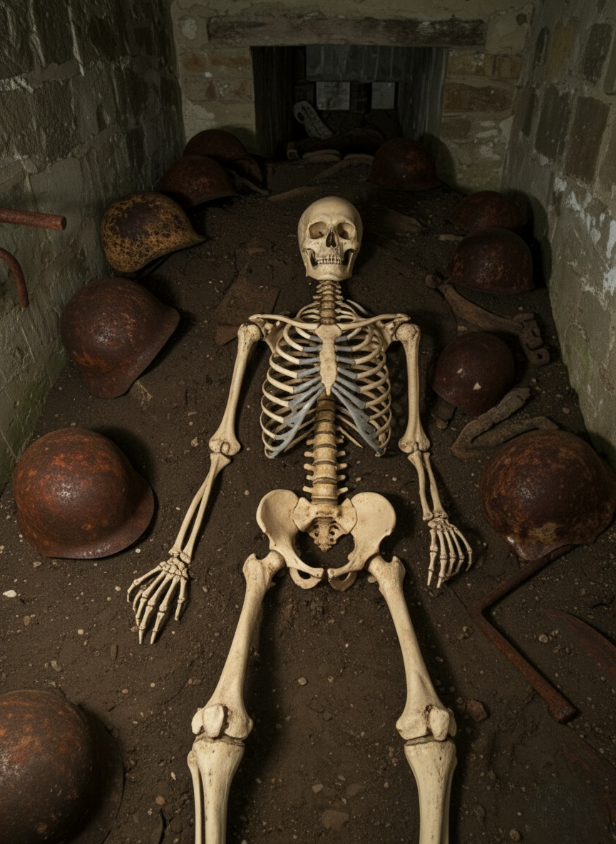 An exploration team investigating a network of sealed underground fortifications has uncovered a discovery as haunting as it is mysterious — a fully articulated human skeleton lying among rusted helmets, shattered equipment, and the decayed remains of early 20th-century weaponry. The find was made deep within a reinforced chamber that appeared untouched for decades, its walls bearing faint inscriptions and scorch marks from apparent explosions. What has shocked investigators most is the eerie symmetry of the scene: the skeleton was positioned upright against the wall, arms folded neatly over the chest, as though placed there intentionally rather than fallen by chance. Nearby, corroded dog tags, collapsed crates, and deteriorated ammunition suggest a wartime context, but no official records mention any combat or personnel lost at the coordinates where the chamber was found. Authorities have sealed off the site for forensic analysis, though images leaked online have already ignited an international wave of speculation and unease.