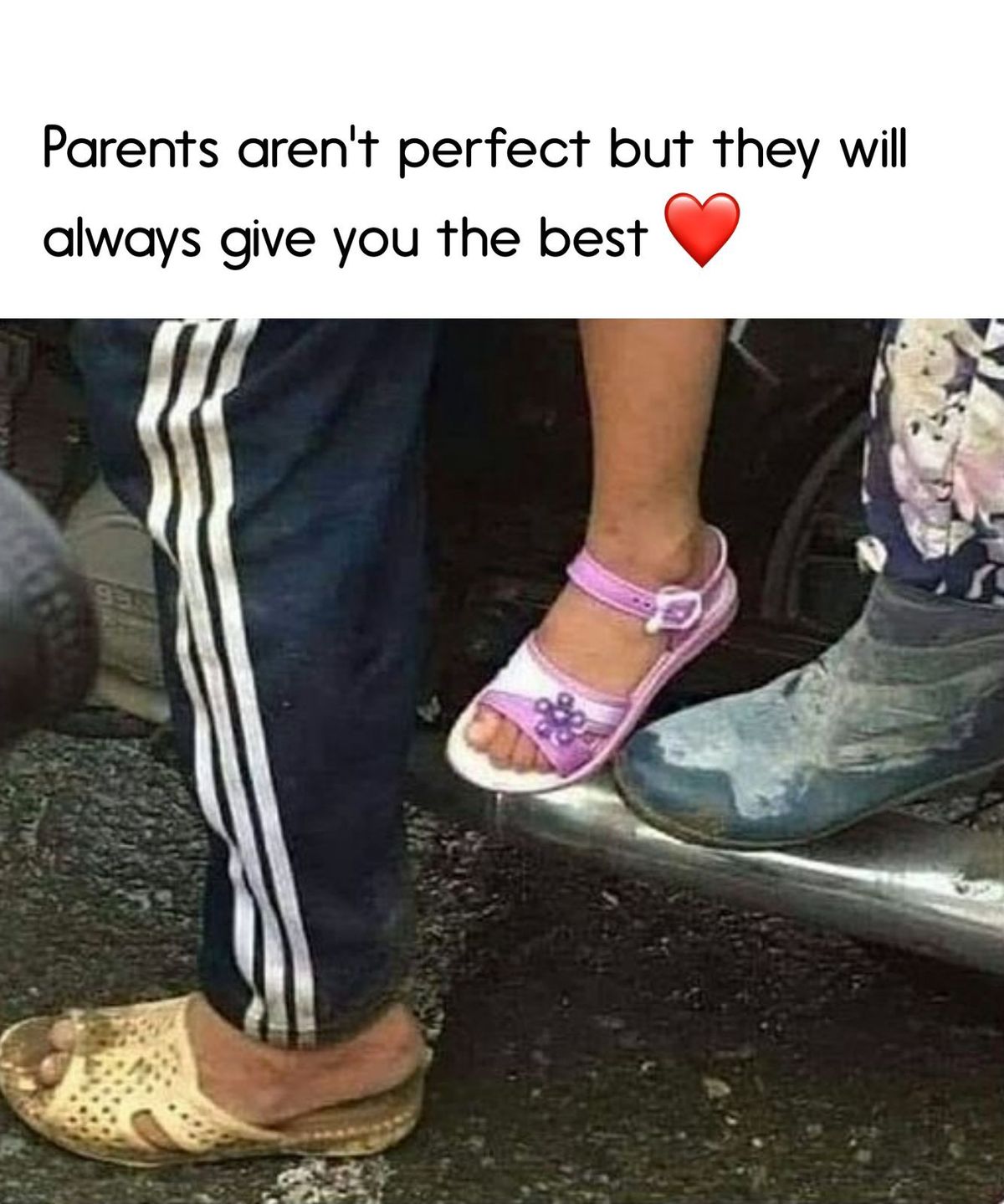 This image speaks volumes about love, sacrifice, and silent strength. At first glance, it shows nothing more than three feet โ one belonging to a child in new, bright shoes, and the others to adults wearing worn-out, mismatched footwear. But look closer, and youโll see one of lifeโs most beautiful truths: Parents arenโt perfect, but they will always give you the best they can. ๐จโ๐ฉโ๐ง๐