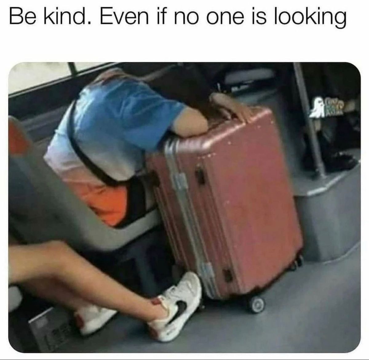 In a world that often celebrates what’s seen, this quiet picture reminds us that true kindness lives in the unseen moments. 💫 A tired traveler sleeps with their head resting on a suitcase — unaware that the person sitting next to them has gently extended their leg to keep the suitcase from rolling away. No words, no spotlight, just silent care. ❤️