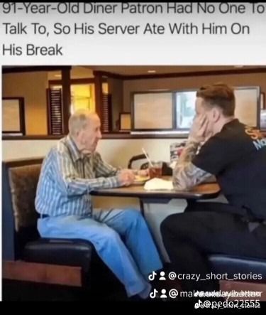 In a busy world where everyone rushes past one another, a simple act of kindness can still stop time. π This touching photo shows a 91-year-old man sitting alone at a diner, quietly eating his meal. The server, noticing he had no one to talk to, did something extraordinary β he sat down beside him during his break, shared a meal, and gave the man something far more nourishing than food: companionship. π₯Ίπ½οΈ