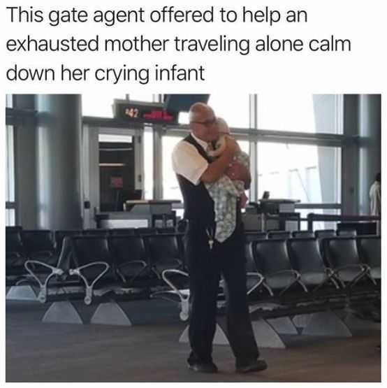 Thatโs when a gate agent โ instead of simply watching or hurrying through his duties โ stepped forward with compassion. He gently took the baby into his arms, rocking and soothing the little one until the crying stopped. For a few precious minutes, the terminal grew softer, the mother exhaled, and the world felt a little lighter. ๐โจ