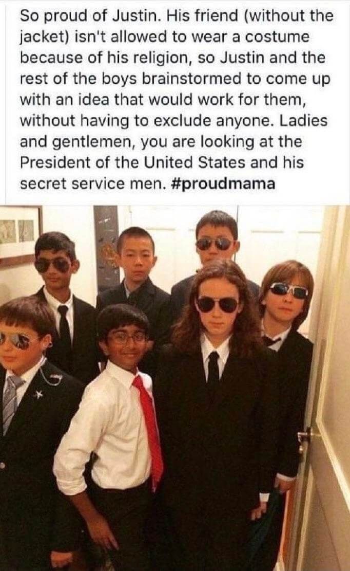 Together, they brainstormed until they found the perfect idea: they would all dress up as the President of the United States and his Secret Service team. Their friend, who couldnโt wear a costume, would play the role of the President, and the rest would be his suited-up Secret Service agents. The result? A creative, respectful, and heartwarming moment that showed how compassion can turn simple ideas into lifelong memories. ๐ถ๏ธโค๏ธ