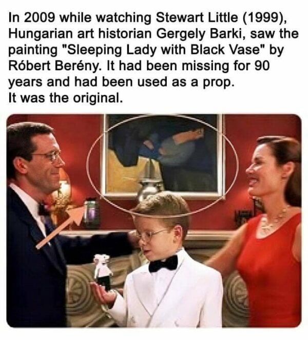 In 2009, Hungarian art historian Gergely Barki sat down to watch the family movie Stuart Little (1999) with his daughter — but what he saw on the screen left him stunned. Behind the actors, hanging quietly on the wall as a simple movie prop, was a painting he instantly recognized: “Sleeping Lady with Black Vase” by Hungarian artist Róbert Berény.