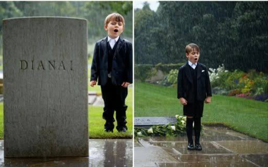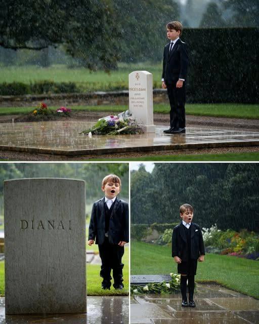 On a quiet, rainy day at Althorp, a deeply emotional scene unfolded — one that would remain in the hearts of all who saw it. Six-year-old Prince Louis, with innocent eyes and a tender spirit, stood beside the grave of Princess Diana, his late grandmother. Though he had never met her, he clutched a small bouquet of wildflowers and whispered to the woman who had shaped so much of his family’s story. Then, without warning, he began to sing — softly, sweetly — as though hoping his voice could reach across time.