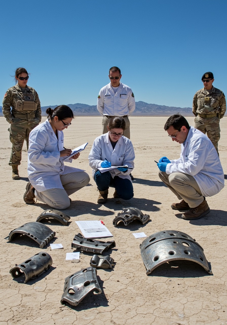 A joint scientific and military expedition in a remote desert basin has uncovered what many are calling one of the most baffling discoveries of the decade — a scattered field of metallic fragments unlike any known material on Earth. The debris, partially buried beneath scorched sand and fused rock, was reportedly detected after a series of unusual seismic and atmospheric readings in the area. Witnesses describe twisted shards and curved plates bearing intricate perforations and geometric patterns, as though once part of a larger structure. Within hours of the initial find, military aircraft were seen circling overhead, and the site was sealed under strict perimeter control. Officials have released no public statements, referring all inquiries to “national defense protocols,” but leaked footage showing researchers in hazmat suits collecting glowing, heat-scorched pieces has already set the internet ablaze.