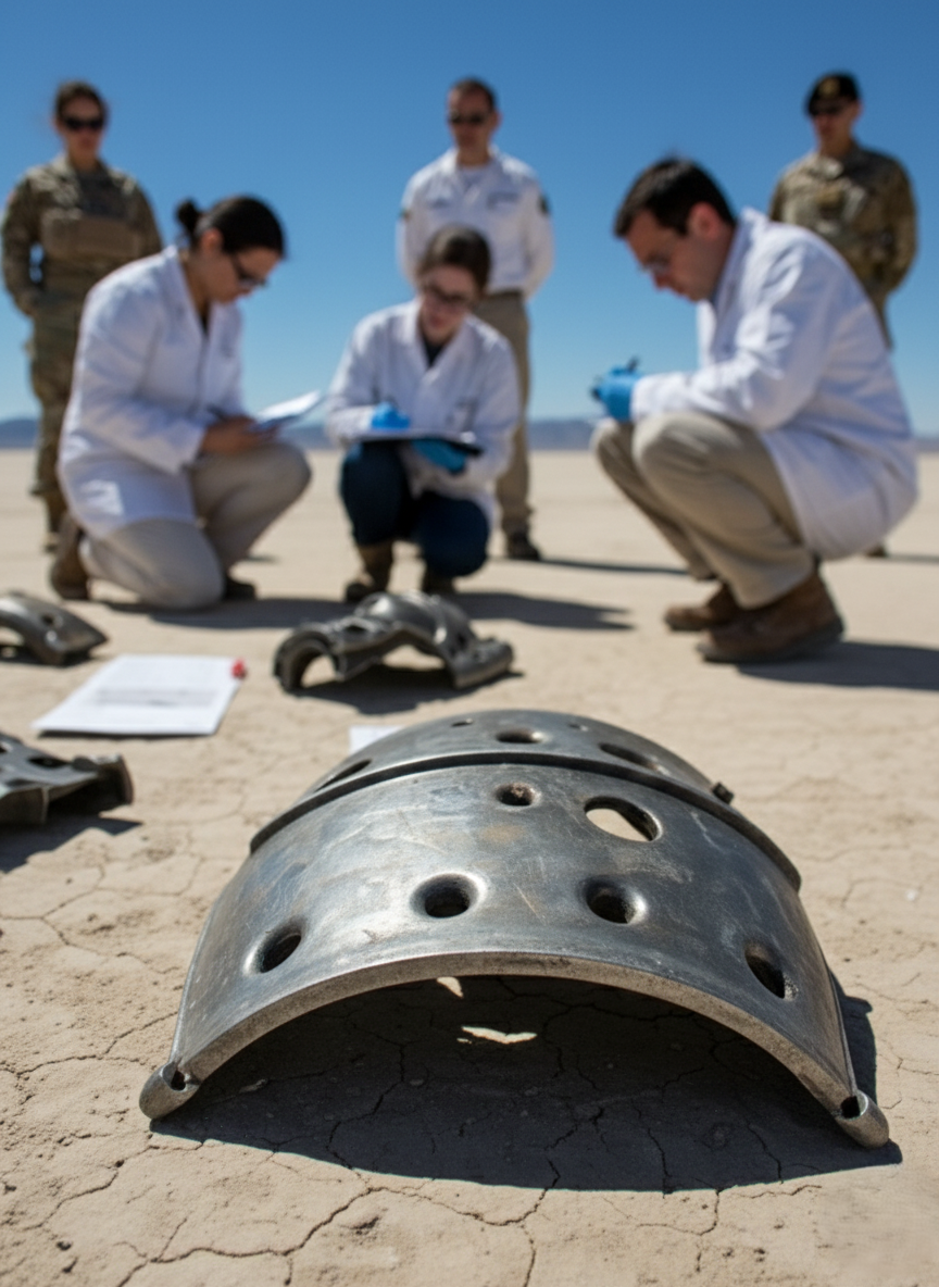 A joint scientific and military expedition in a remote desert basin has uncovered what many are calling one of the most baffling discoveries of the decade — a scattered field of metallic fragments unlike any known material on Earth. The debris, partially buried beneath scorched sand and fused rock, was reportedly detected after a series of unusual seismic and atmospheric readings in the area. Witnesses describe twisted shards and curved plates bearing intricate perforations and geometric patterns, as though once part of a larger structure. Within hours of the initial find, military aircraft were seen circling overhead, and the site was sealed under strict perimeter control. Officials have released no public statements, referring all inquiries to “national defense protocols,” but leaked footage showing researchers in hazmat suits collecting glowing, heat-scorched pieces has already set the internet ablaze.