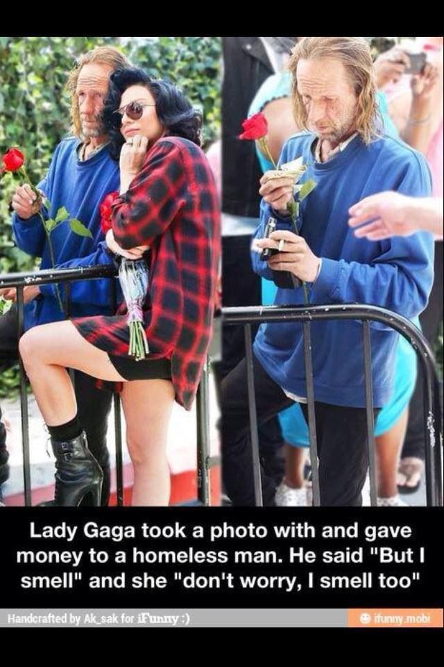 In a world often blinded by fame, luxury, and perfection, there are rare moments that remind us of what truly matters β kindness, humility, and the beauty of human connection. This heart-warming photo captures one such moment: Lady Gaga, one of the most iconic stars in the world, standing beside a homeless man who held a single red rose. He hesitated to come close, whispering, βBut I smell.β Without missing a beat, she smiled and replied softly, βDonβt worry, I smell too.β ππΉ