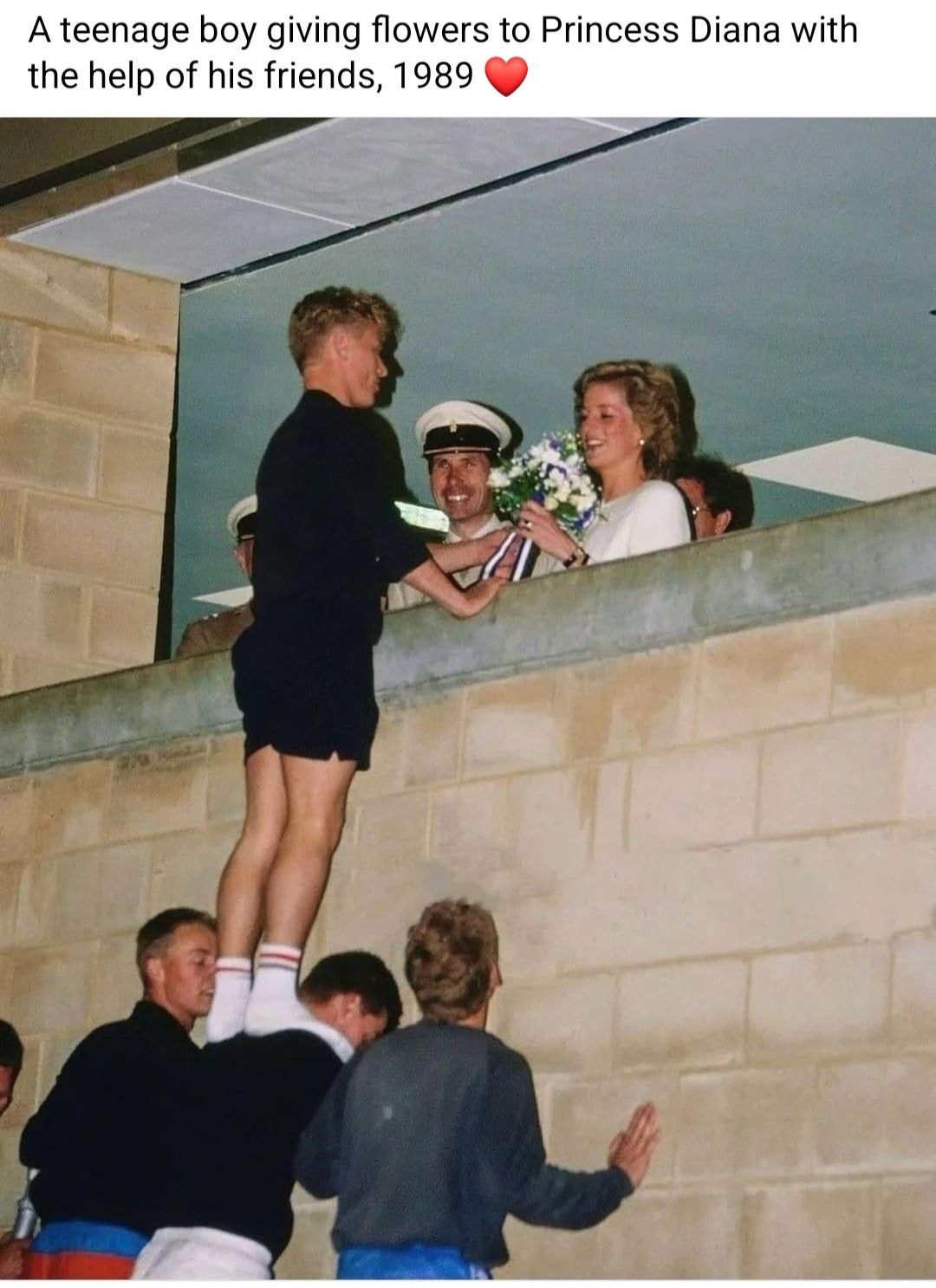 In 1989, a single act of kindness captured the very essence of humanity โ a teenage boy, supported by his friends, reaching up to offer Princess Diana a bouquet of flowers. ๐ It wasnโt planned, rehearsed, or part of any ceremony โ just a spontaneous gesture from a young heart wanting to honor โThe Peopleโs Princess.โ