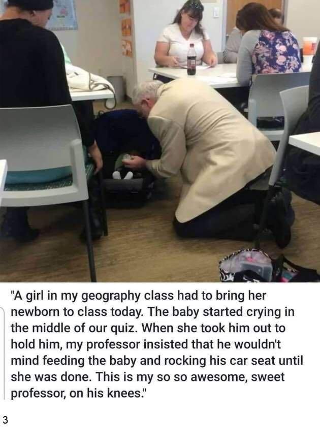 Her professor, a kind-hearted man with silver hair and years of wisdom, knelt down beside the babyโs car seat, gently picked up the bottle, and began to rock the baby himself. ๐ถโค๏ธ He told the mother, โDonโt worry, finish your quiz. Iโll take care of him for now.โ While the mother returned to her desk with tears in her eyes, the professor quietly soothed the baby, feeding him and rocking him gently โ not as a teacher, but as a human being who understood what kindness truly means.