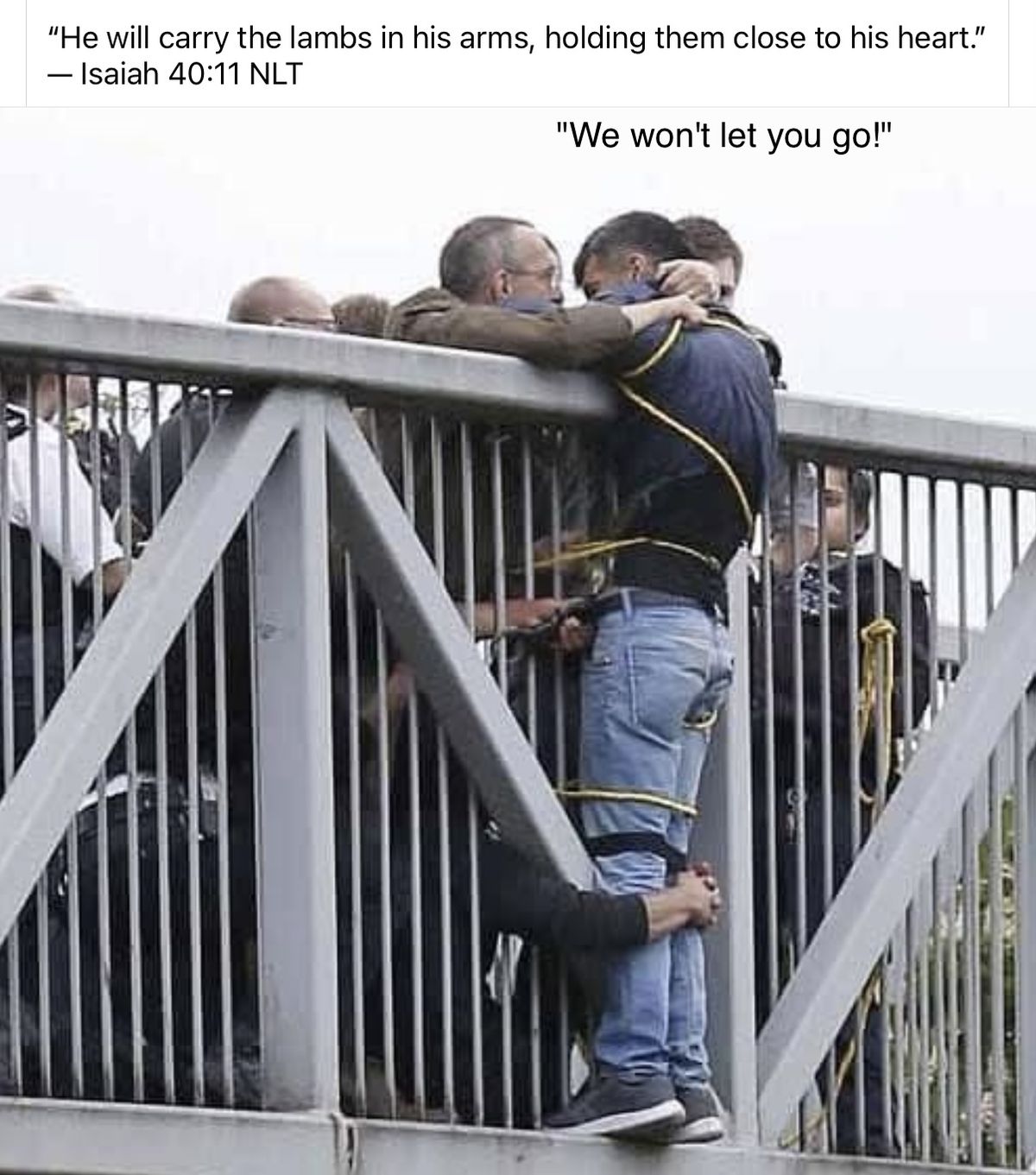 This powerful photo captures a moment of raw humanity on a bridge β a man on the verge of giving up, surrounded by strangers who refused to let him fall. One man holds him in a tight embrace, whispering words of comfort. Another grips his legs firmly from below, while others tie ropes around him, anchoring him back to life. π