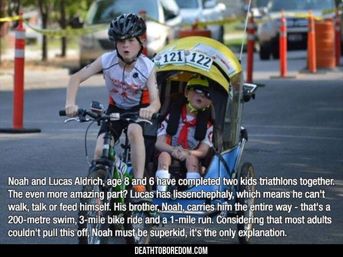 During every triathlon, Noah swims 200 meters pulling Lucas behind him in a raft, cycles 3 miles towing him in a bike trailer, and runs a full mile pushing him in a stroller — never once leaving his brother’s side. 🥇