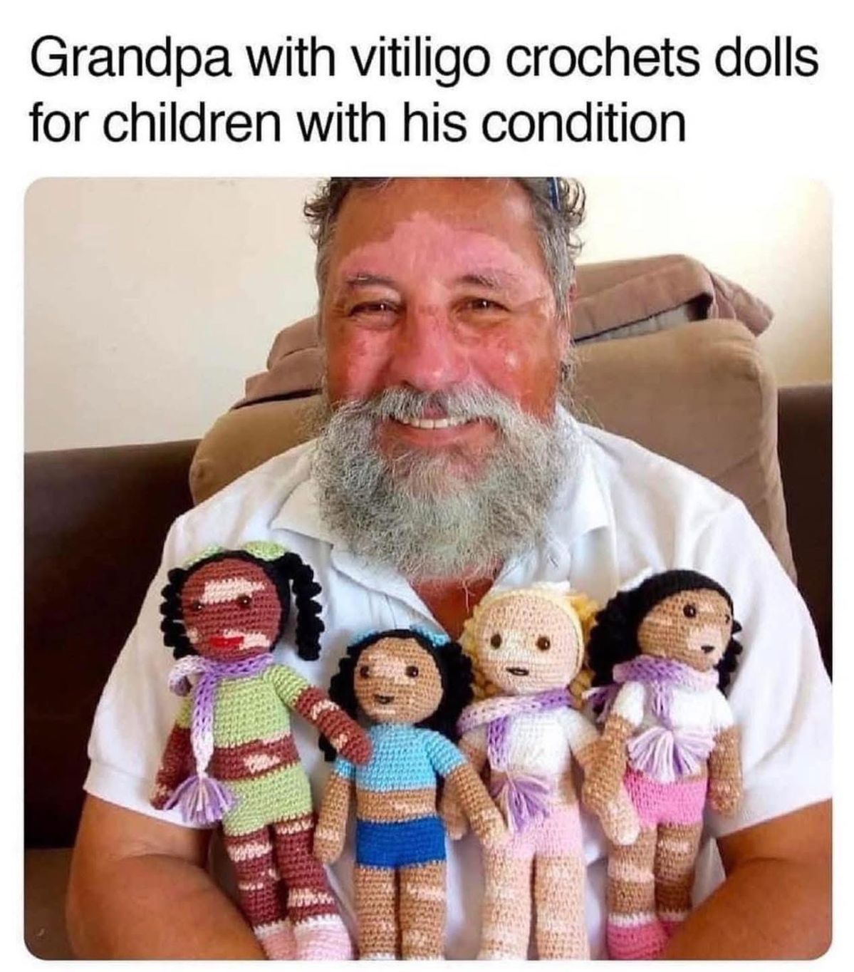 He crochets dolls that look just like him — with beautiful patterns of different skin tones — and gives them to children who share his condition. For those little ones, holding a doll that looks like them means everything. It’s a message that says: