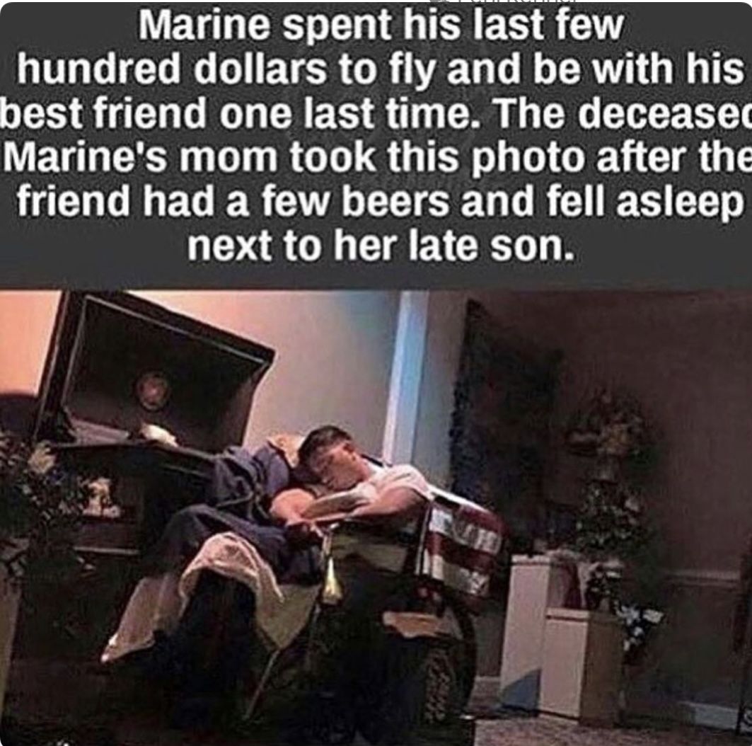 The story tells of a Marine who spent his last few hundred dollars to fly across the country to say goodbye to his best friend, a fallen comrade. After the funeral, grief and memories overtook him. He shared a few beers, reminisced about their time together โ and, exhausted, fell asleep beside the casket of the man who had once stood beside him in uniform. ๐บ๐ธ