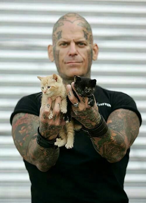 At first glance, he looks like someone you wouldnโt want to mess with โ a tall, muscular man, tattoos etched deep into his skin, his expression fierce and unwavering. But then you notice what heโs holding: two tiny kittens, fragile and trembling, resting safely in his inked hands. ๐ฑโจ