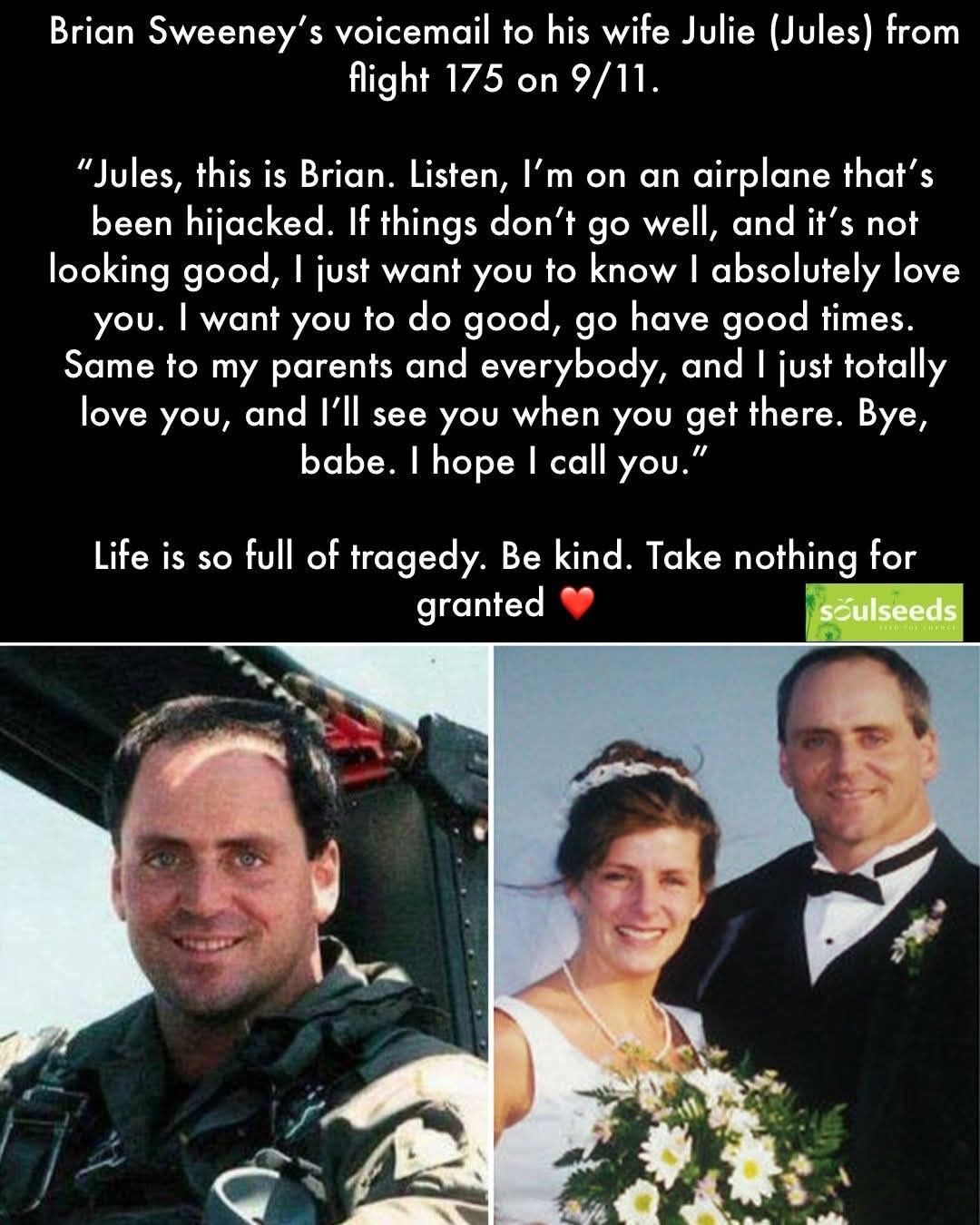 On September 11, 2001, amidst chaos and terror, a man named Brian Sweeney sat aboard United Airlines Flight 175 — one of the planes hijacked in the attacks that changed the world forever. As the plane was overtaken, Brian didn’t cry or panic. Instead, he picked up his phone and left a voicemail for the love of his life, his wife Julie (Jules). 💔 His words were calm, filled with love, strength, and peace: “Jules, this is Brian… If things don’t go well, I just want you to know I absolutely love you…” Those few sentences carried the weight of a lifetime — a husband’s farewell, a hero’s courage, and a human heart refusing to let fear be the last thing remembered. 🕊️