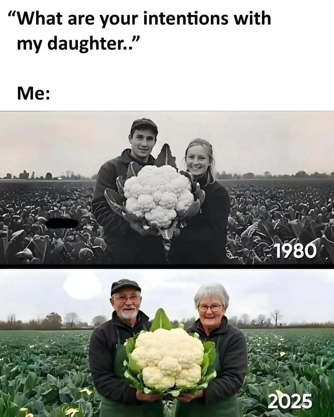 Fast forward to 2025 β the same couple, now older and grayer, still standing in the same field, holding another cauliflower together. π The years have etched lines on their faces but not on their hearts. Their love has endured storms and seasons, yet remains strong, pure, and full of life β just like the vegetables theyβve nurtured. π₯¬π Itβs not just a funny meme β itβs a beautiful reminder that true intentions donβt fade with time. They grow, they flourish, and they feed generations to come.