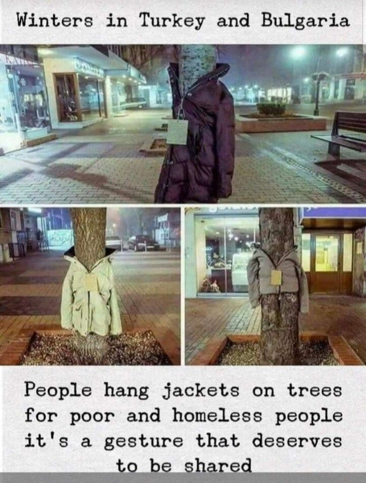 In the freezing winters of Turkey and Bulgaria, where icy winds cut through empty streets, something extraordinary happens — not from governments or big organizations, but from ordinary people with extraordinary hearts. 🌨️💞 Locals hang warm jackets on trees so that anyone without a home, without shelter, or without enough to stay warm can take one freely. 🧥🌳