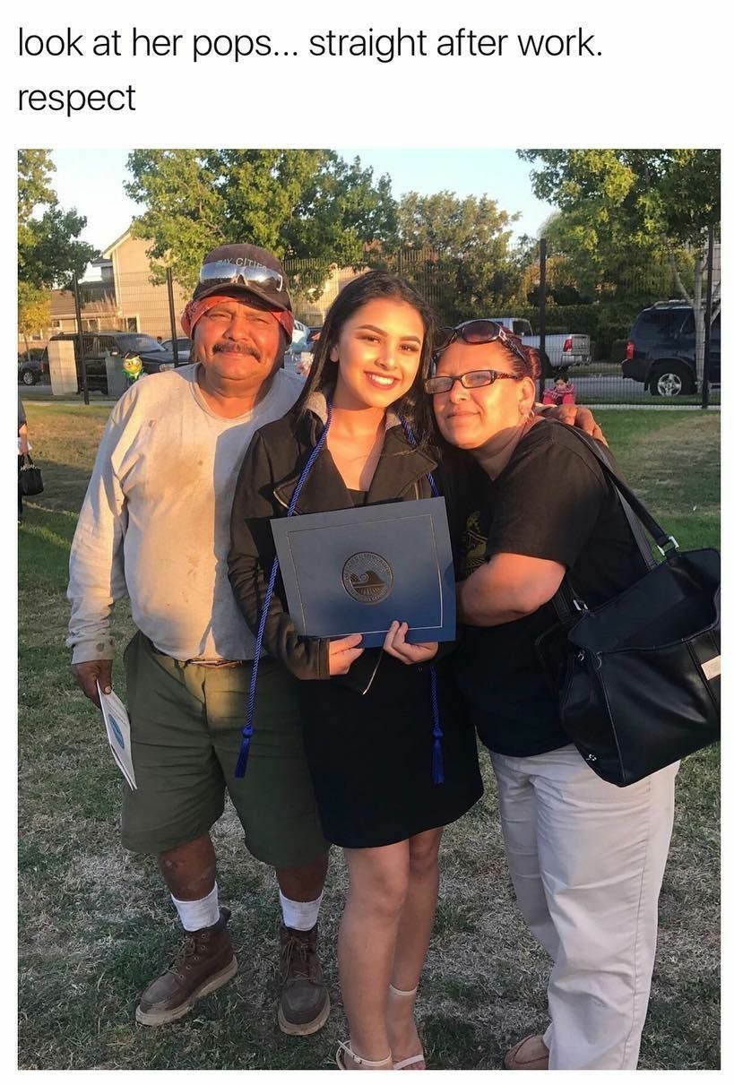 In this powerful and emotional photo, a father stands proudly beside his daughter on one of the most important days of her life — graduation day. 💕 Still wearing his work clothes, dusty and worn from a long day of labor, he rushed straight from his job to be there for her moment of triumph. His presence, his smile, and his pride say everything: love doesn’t need a suit — it just needs heart. 💪👨‍👧