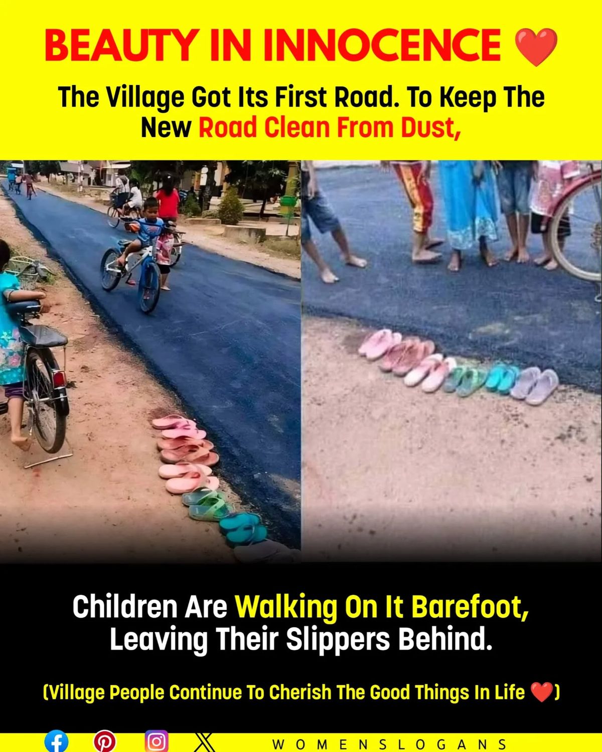 As the children stepped onto the fresh asphalt, they quietly removed their slippers and walked barefoot, afraid to make it dirty ๐ฉด๐ฃ. Lined neatly by the side of the road, their colorful sandals told a story of innocence, respect, and joy โ the kind only found in grateful hearts ๐๐. These children, though living with little, understood something profound: that blessings, no matter how small, should be cherished, protected, and celebrated with care.