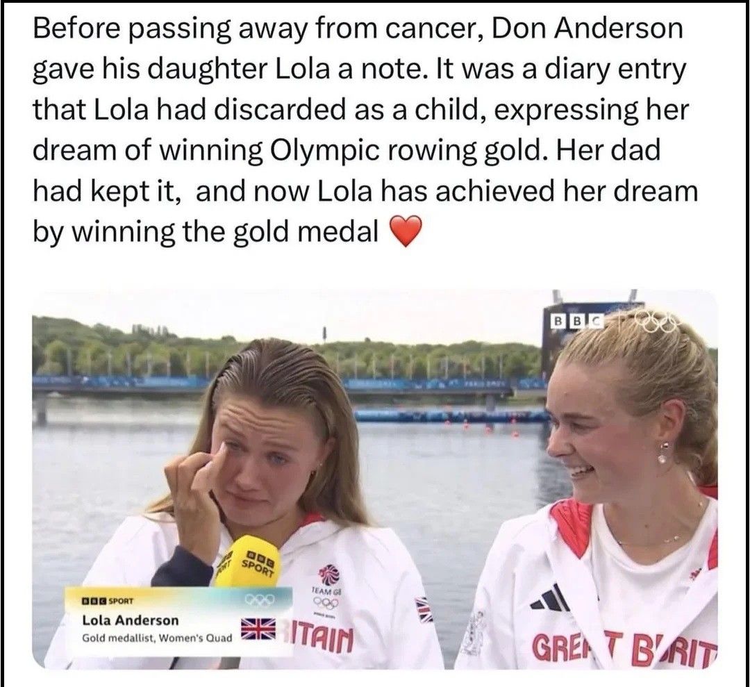 Some dreams are born in childhood, tucked away in forgotten journals โ but sometimes, love makes sure they never fade ๐ซโค๏ธ. Before losing his battle with cancer, Don Anderson gave his daughter Lola a note โ a cherished keepsake he had held onto for years. Inside was a diary entry Lola had written as a little girl, where she dreamed of one day winning an Olympic gold medal in rowing ๐ฃโโ๏ธ๐.