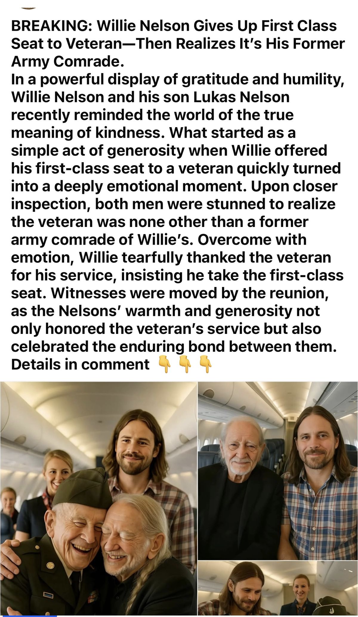 Some stories donโt just warm the heart โ they remind us of the goodness still alive in the world. ๐๐ On a recent flight, legendary musician Willie Nelson offered his first-class seat to a veteran as a simple act of kindness. But what unfolded next was nothing short of destiny. When the two men exchanged smiles, recognition struck โ the veteran was none other than Willieโs former army comrade, a brother-in-arms from decades ago. ๐ซ